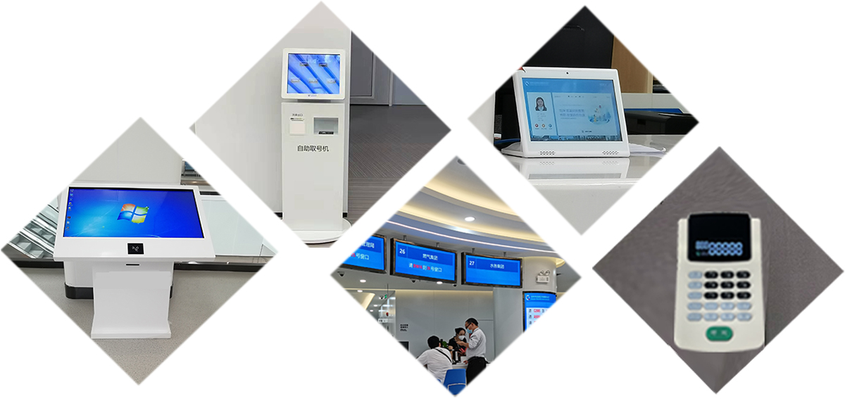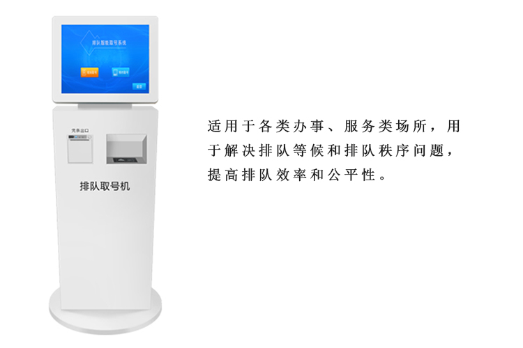 排隊叫號系統(tǒng)匹配的取號機,常規(guī)尺寸有17、18.5、21.5、32、43、55寸,外設包括小票打印機、二維碼掃描模塊、身份證讀卡器模塊。